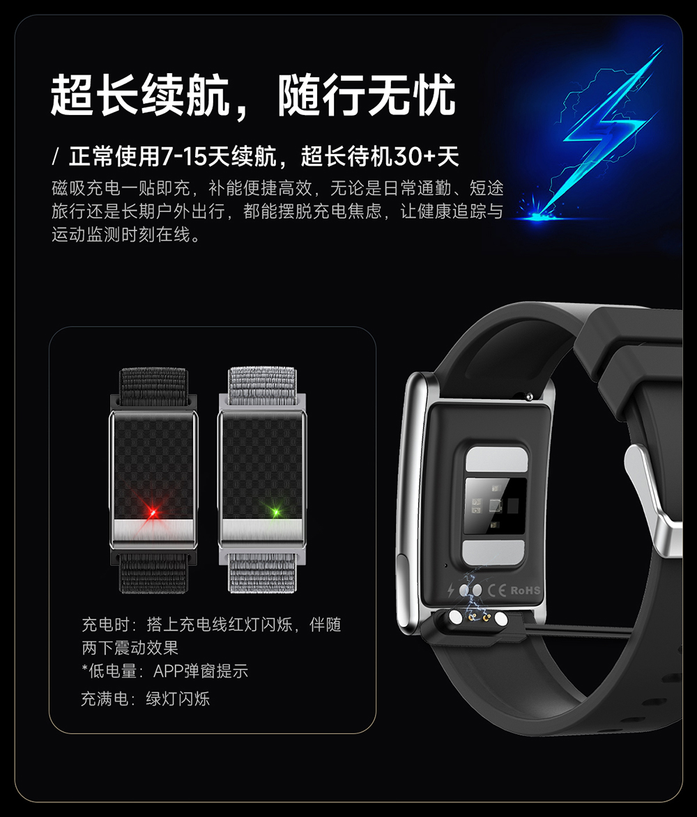 ECG心脏健康分析、心率监测,24小时科学睡眠监测、血氧监测,HRV监测、女性健康(经期跟踪)、远程亲友关爱、血液成分监测、身体成分检测(BMI体脂率等)、压力监测、等健康功能。 |