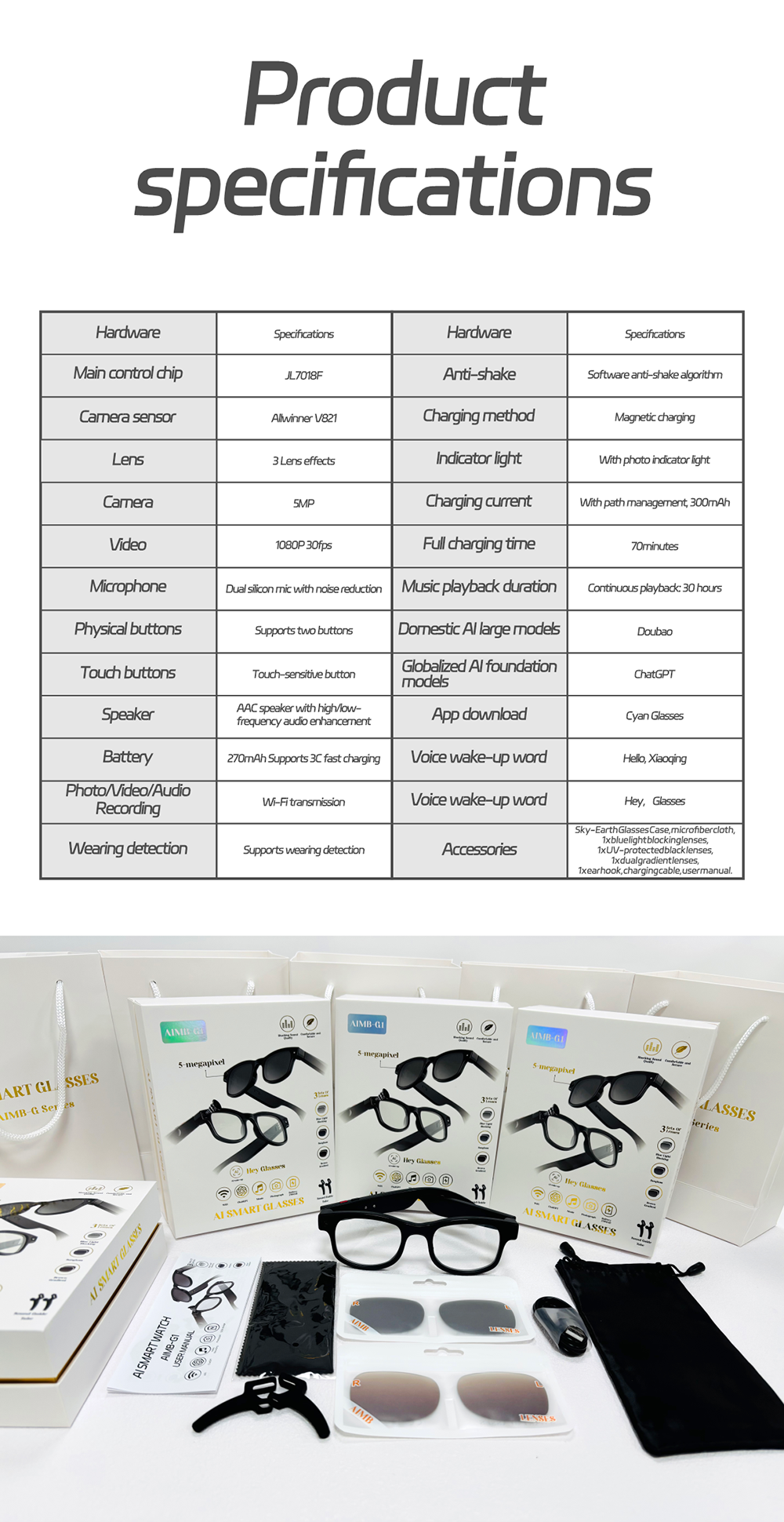 产品亮点: AIMB-G1 AI智能眼镜将尖端的人工智能与时尚的日常眼镜设计相结合。这些智能眼镜配备了内置语音助手和实时语言翻译功能,可帮助您进行跨境交流,无论您是在旅行、远程工作还是探索新文化。AIMB-G1配备500万像素摄像头、触摸+物理控制、WiFi连接和长达30小时的音频播放,是连接生活方式的终极可穿戴设备。
