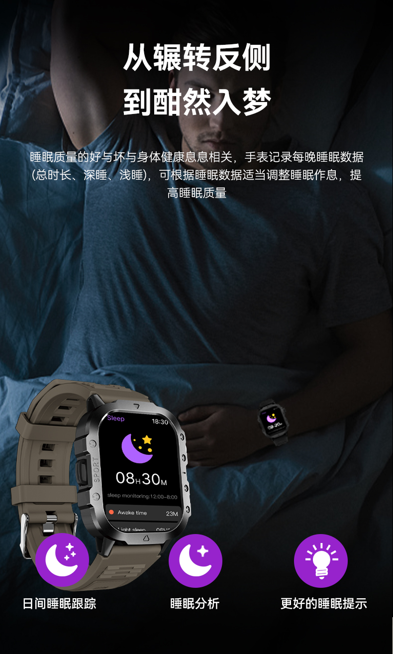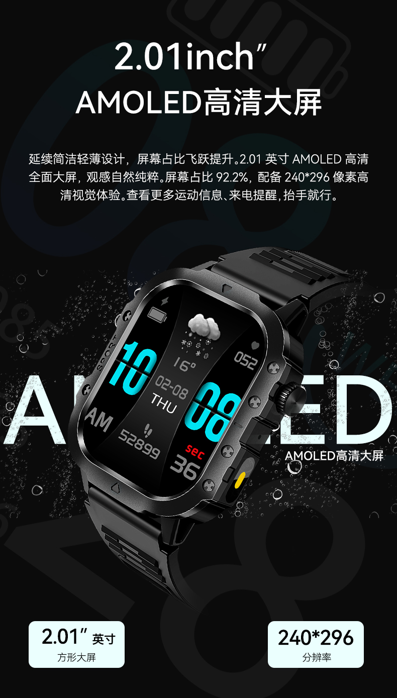 产品亮点: 配备 2.01 英寸高清曲面屏,视觉体验出色;支持无线充电,充电时只需将连接器靠近手表背部,内置磁铁即可自动固定,充电快速稳定;具备蓝牙通话功能,可直接在手表上接听、拨打和挂断电话,查看通话记录,让沟通更便捷。它拥有多种运动模式,如跑步、篮球、健身、骑行等,能精准计算卡路里消耗,助力你制定科学运动计划。同时,搭载新光学传感器,可实时监测心率、睡眠、血压、血氧等健康数据,让你随时掌握自身健康状况。