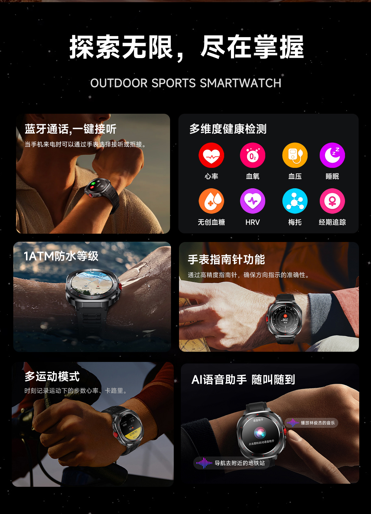 产品亮点: 这是一款集健康管理、户外探索、智能交互于一体的智能健康运动手表。以高清全触摸屏和三键操控为交互核心,融合蓝牙通话、多维度健康监测、1ATM 防水、指南针、多运动模式、AI 语音助手等功能,搭配长续航磁吸充电设计,为用户提供从日常健康管理到户外场景探索的全方位智能体验,是追求健康生活与户外乐趣人群的理想选择。