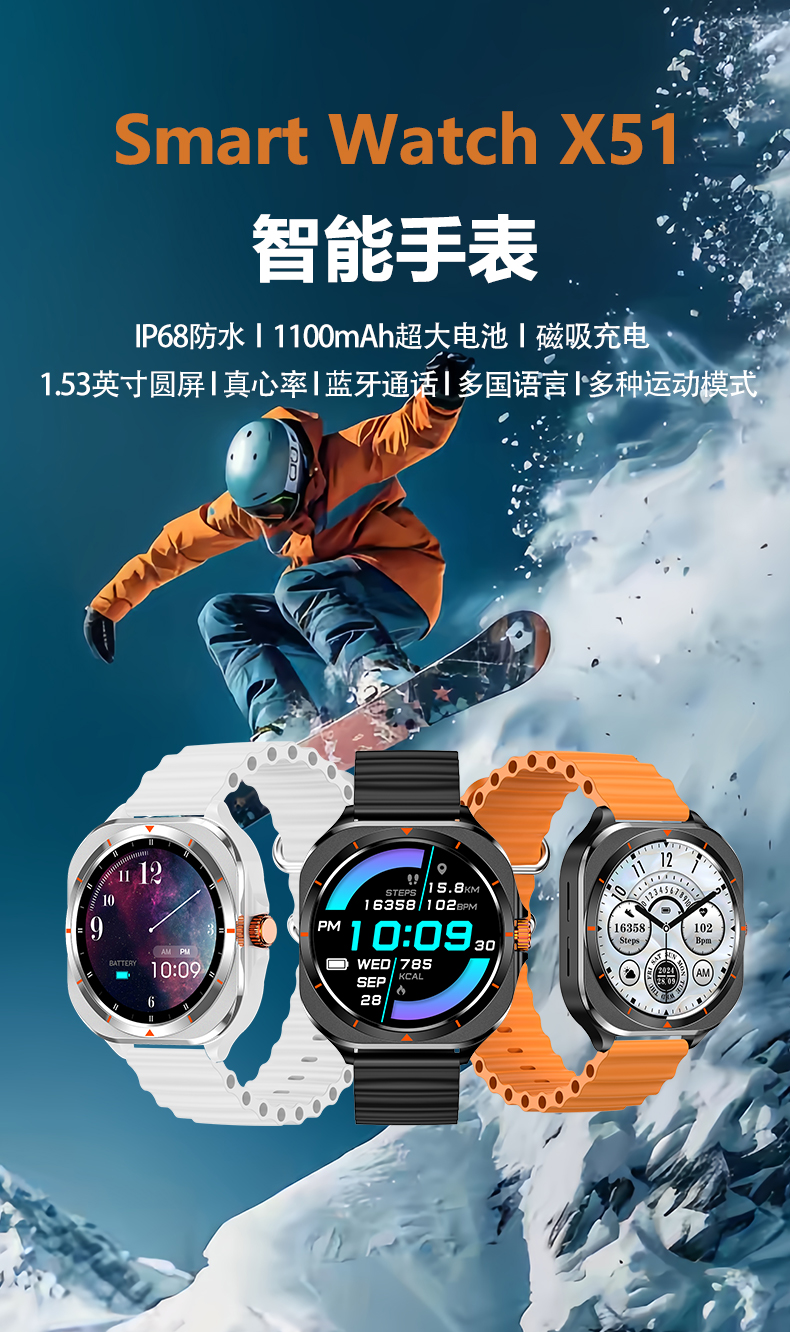 X51 智能手表 是一款集时尚设计、强大功能与持久续航于一体的高端智能穿戴设备。无论你是健身爱好者、商务人士,还是日常通勤族,X51 都能成为你腕间的贴心助手。