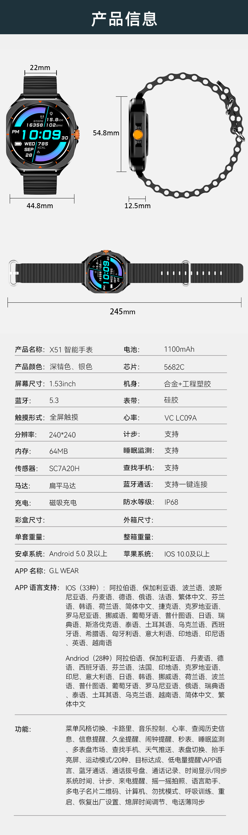 产品亮点: 这款X51智能手表,不是普通的手环,而是真正的智能手表!它有1.53英寸大屏,支持蓝牙通话,还能游泳戴!关键是——续航200天,充一次电用半年