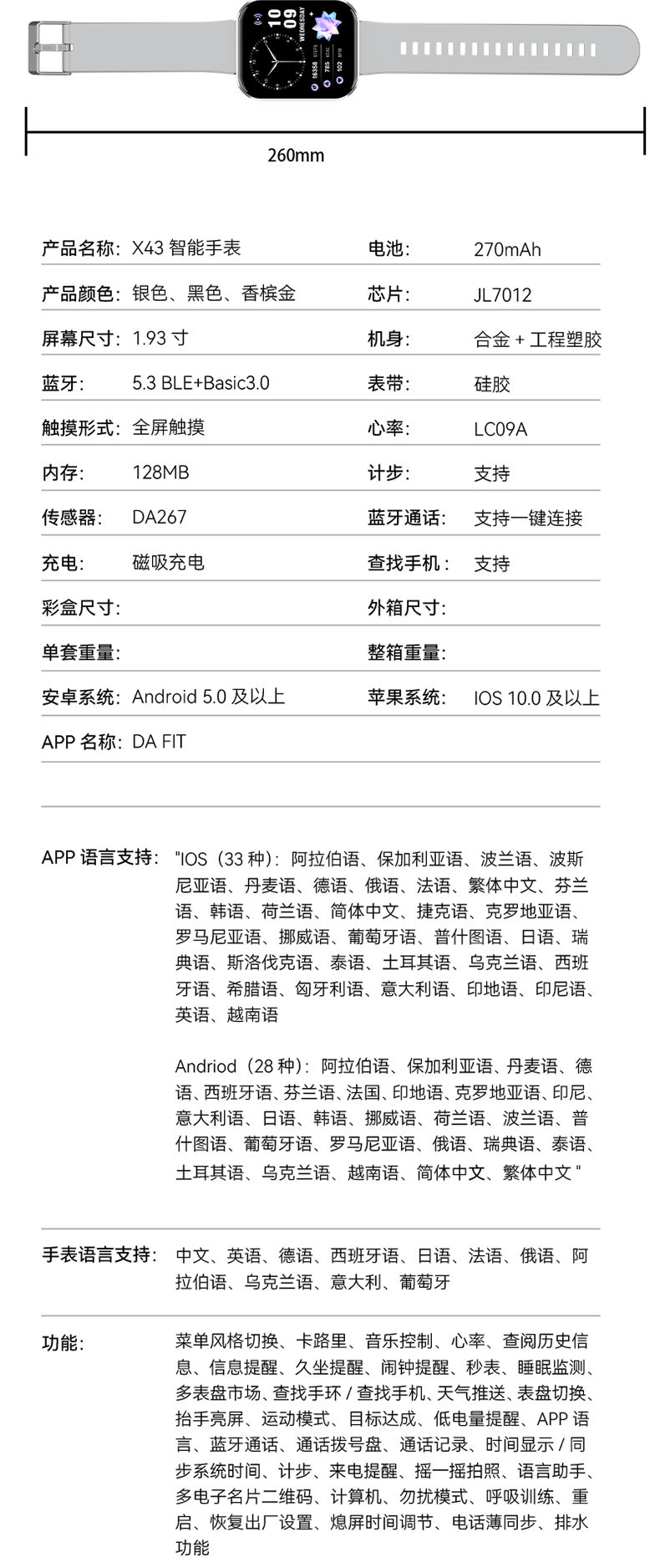 这是一款集时尚外观、强大功能与卓越性能于一体的智能手表。采用铝合金与硅胶表带结合设计,轻盈耐用,佩戴舒适。1.93英寸AMOLED高清触摸屏,色彩鲜艳,显示清晰,支持多种个性化表盘切换。内置高性能传感器,实时监测心率、血氧、睡眠质量等健康指标,并通过手机APP同步数据分析,帮助用户科学管理健康。支持蓝牙通话、消息提醒、天气预报、闹钟等功能,满足日常生活需求。同时具备50米防水等级,适用于游泳、淋浴等多种环境。磁吸式充电设计,安全便捷,充电效率高。