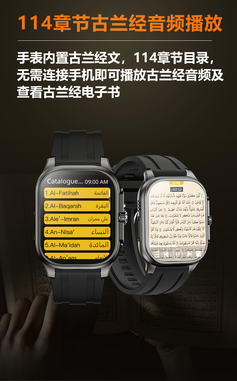 产品亮点: M77 Max 全新升级款穆斯林智能手表,内置 114 段古兰经音频、语音祈祷、朝向(Qibla)指示、礼拜提醒等核心伊斯兰功能,操作简单,适合成人与儿童使用。手表支持 IP68 防水、400mAh 大电池、高清全触屏,是一款兼具宗教功能与日常运动健康管理的全场景伊斯兰智能穿戴设备。