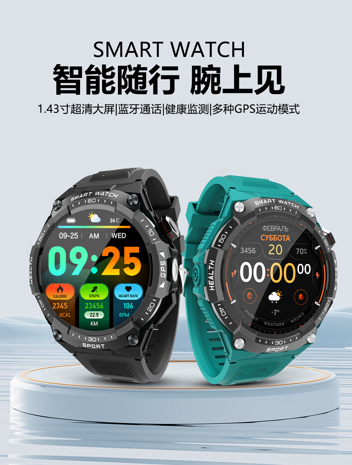 产品亮点: WB0043智能手表内置GPS模块,可实现精确定位和实时路线跟踪。配备1.43英寸高清显示屏、430mAh电池和多种健康监测功能,专为户外运动、健身和智能生活而设计。