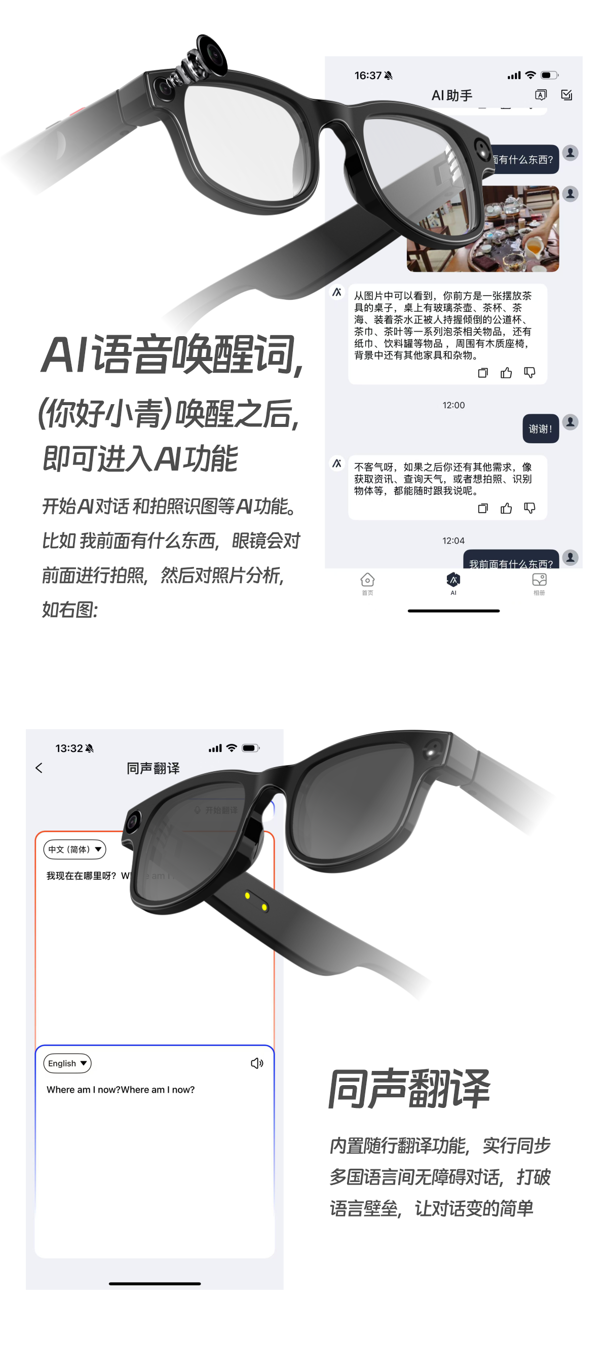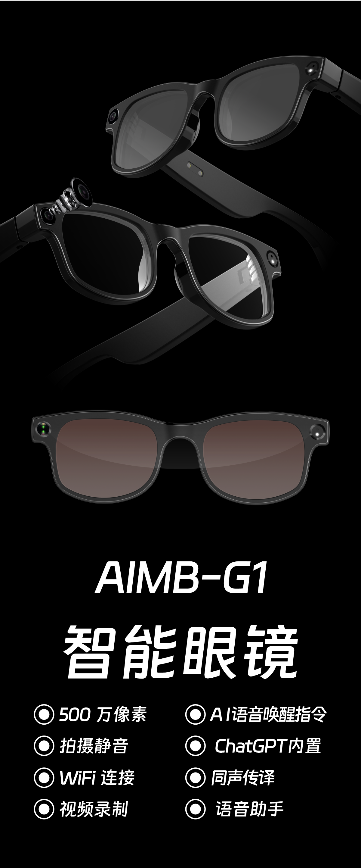 产品亮点: AIMB-G1 AI智能眼镜将尖端的人工智能与时尚的日常眼镜设计相结合。这些智能眼镜配备了内置语音助手和实时语言翻译功能,可帮助您进行跨境交流,无论您是在旅行、远程工作还是探索新文化。AIMB-G1配备500万像素摄像头、触摸+物理控制、WiFi连接和长达30小时的音频播放,是连接生活方式的终极可穿戴设备。
