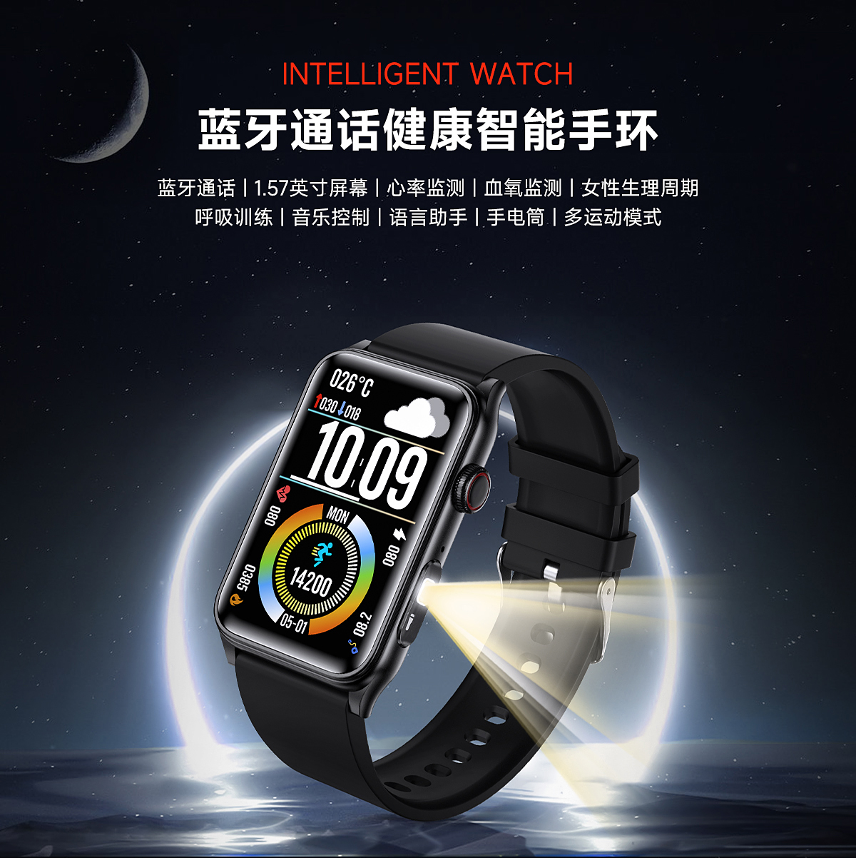 蓝牙通话,强光手电筒,无创血糖测量,血氧监测,呼吸训练、体温功能,女性健康(经期跟踪),心率监测,血压监测,睡眠监测、久坐提醒等健康功能。 运动功能:计步/卡路里/距离,多运动模式。 超长续航待机。多表盘切换,来电信息提醒,闹钟,1.57英寸高分辨率200*320全触摸大屏,音乐控制,计算器。 |