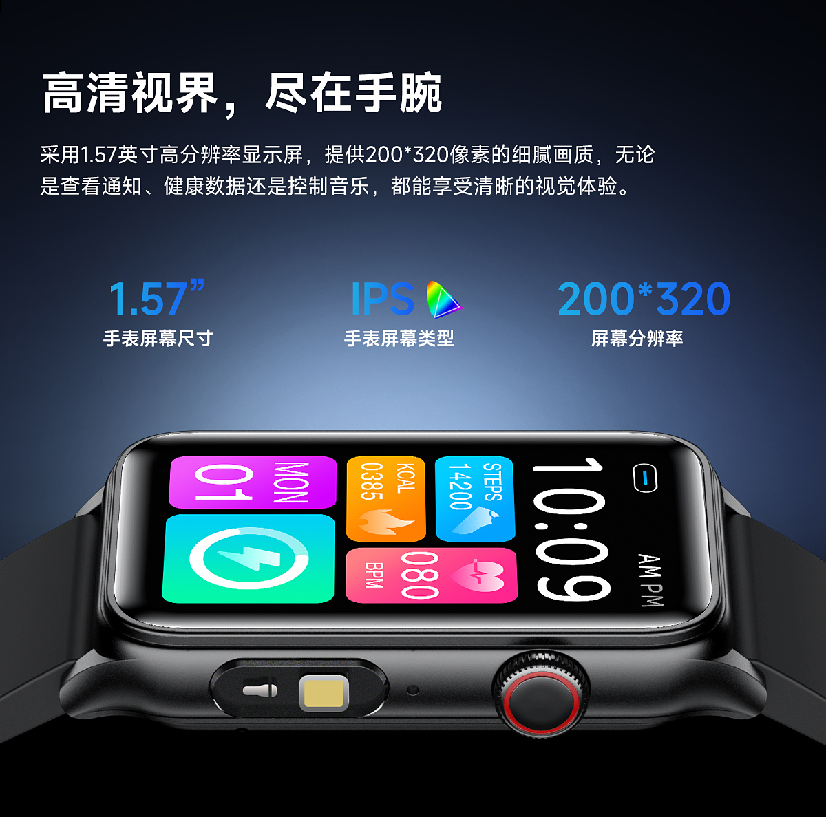 蓝牙通话,强光手电筒,无创血糖测量,HRV功能,梅脱功能,体温功能,血氧监测,呼吸训练、压力监测,女性健康(经期跟踪),心率监测,血压监测,睡眠监测、久坐提醒等健康功能。 计步/卡路里/距离,多运动模式,音乐控制,1.57英寸高分辨率200*320全触摸大屏 |
