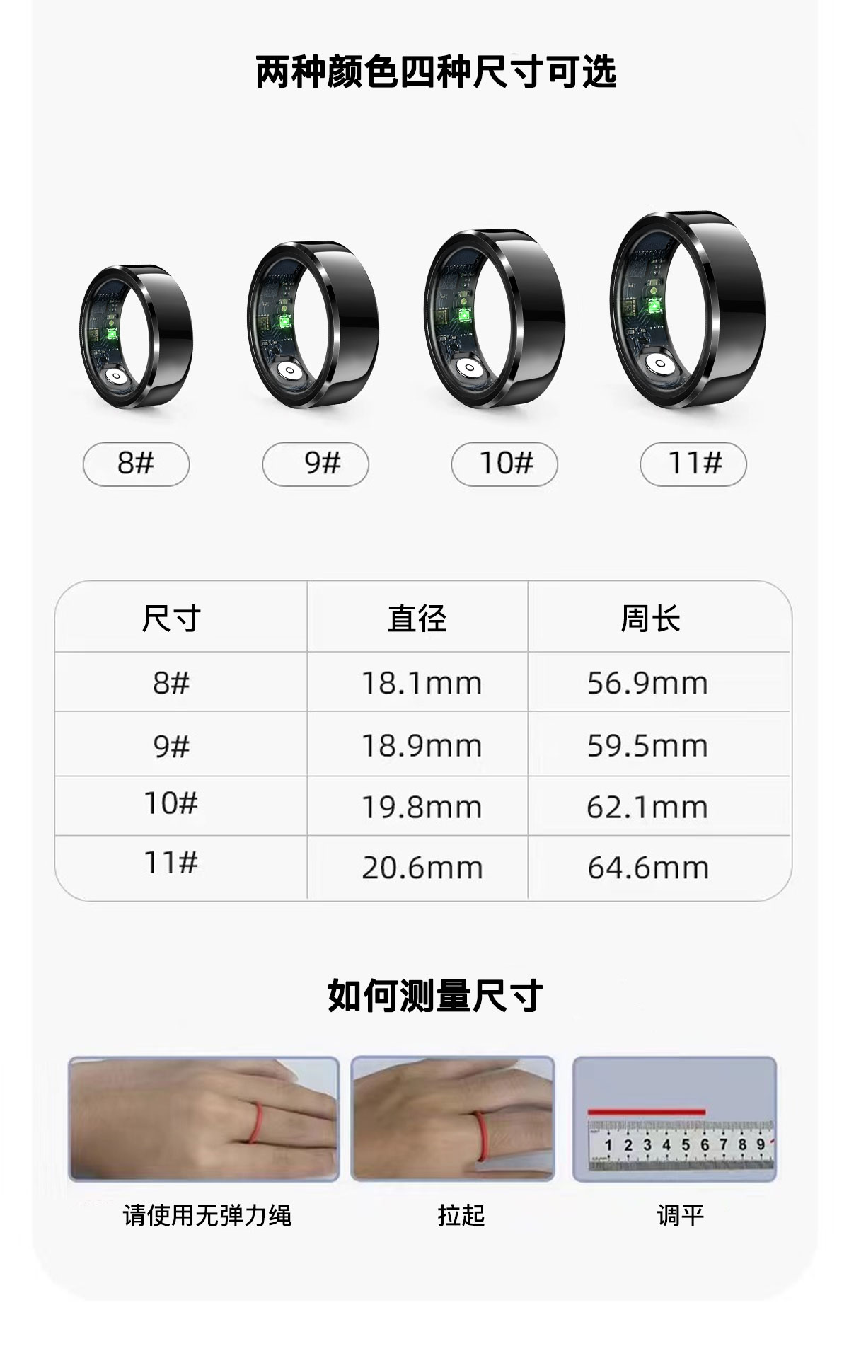 智能健康指环 —— 让未来触手可及 这不仅仅是一枚戒指,更是您指尖上的私人健康顾问。它集成了心率传感器和血氧传感器,能够同步运行,精准捕捉身体状态变化。硬质外圈搭配柔软内侧设计,佩戴贴合无压感,全天候舒适体验。