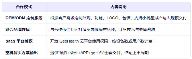 我们提供从硬件设计、软件系统、数据服务到品牌赋能的一站式解决方案,满足多样化场景下的健康监测与管理需求。